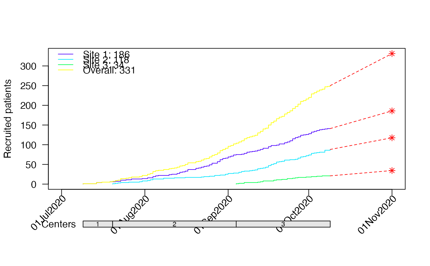 accrual_plot_predict(accrual_df=accrual_df,target=target,col.obs=topo.colors(length(accrual_df)))