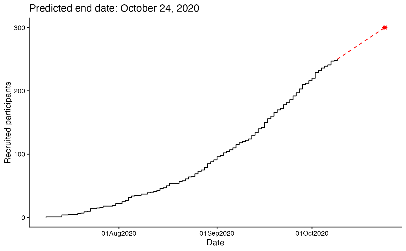 gg_accrual_plot_predict(accrual_df = accrual_df, target = 300)