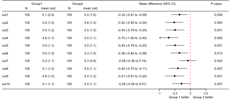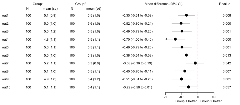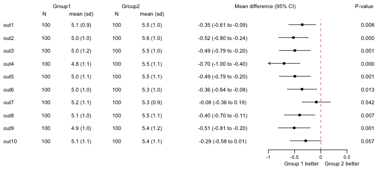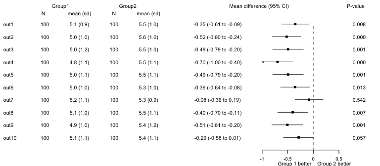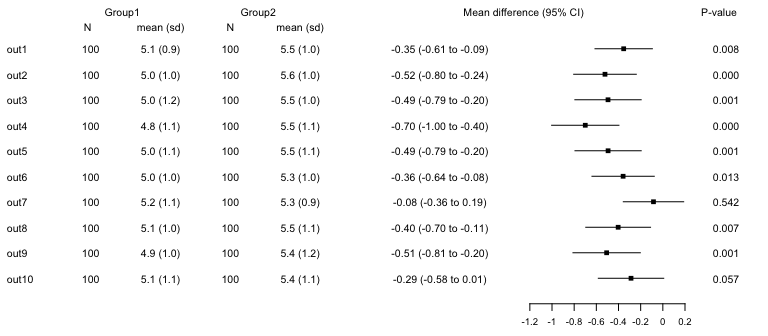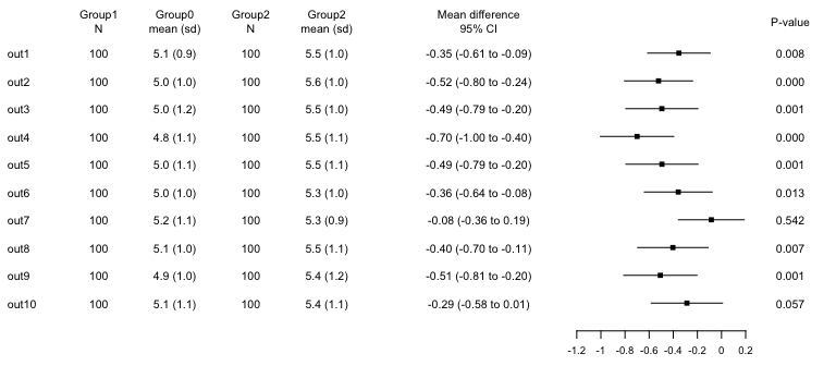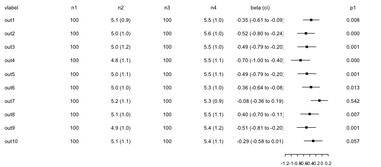 #> 10 out10 100 5.1 (1.1) 100 5.4 (1.1) -0.28700316 -0.5822050 0.008198722 0.057The nx columns include the number of observations and descriptives (mean (sd)) for each group, beta is a mean difference, p1 the p-value.
