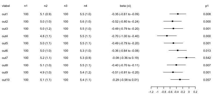 #> 8 out8 100 5.1 (1.0) 100 5.5 (1.1) -0.40311974 -0.6955442 -0.110695309 0.007