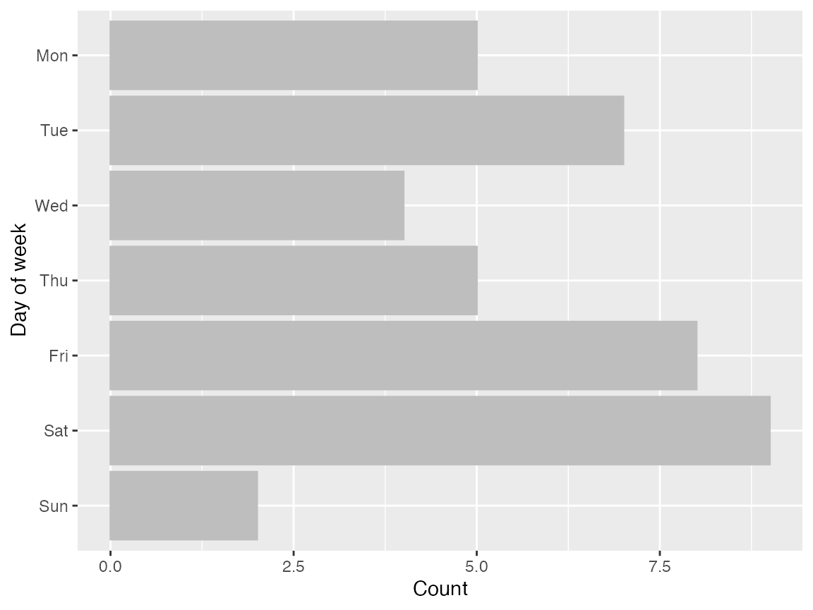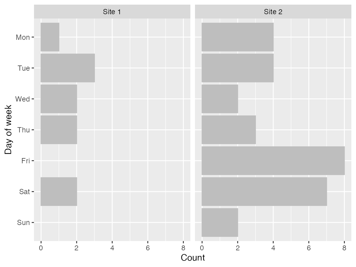 In clinical trials, it may be odd for randomizations and visits to occur at the weekend. This depends on the local customs of course, and the trial itself. For example, it might be reasonable to expect a trial in an emergency department to recruit at the weekend, while a trial in a department that does not schedule appointments would not. As such, depicting the day of week that participants have visits may be useful.
