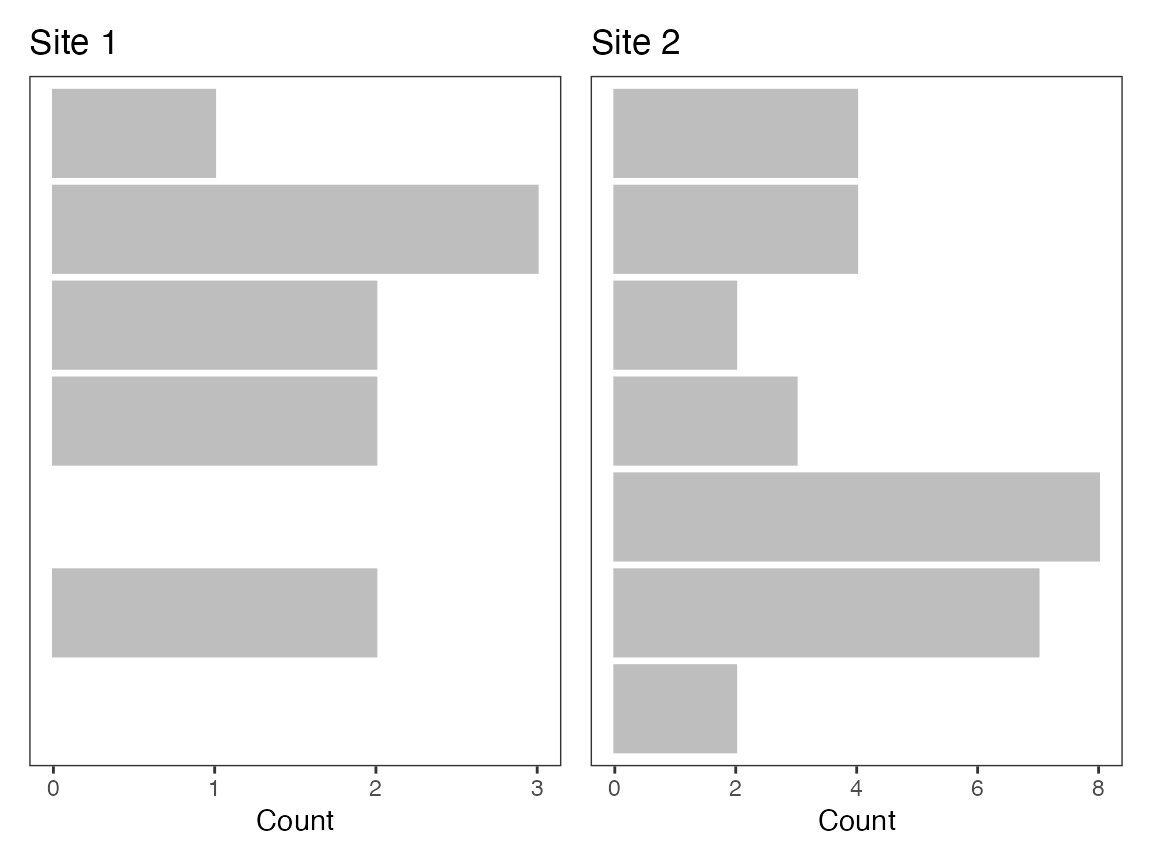 by = c(rep("Site 1", 10), rep("Site 2", 30))