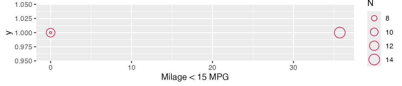 #> 1 Milage < 15 MPG 5 32 32 15.62500