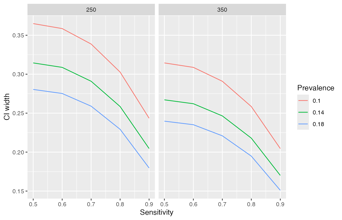 #> n is the number of positives, ntot the full sampleWe can also use expand.grid to pass scenarios varying multiple parameters simultaneously. Below we vary sensitivity, prevalence and sample size.