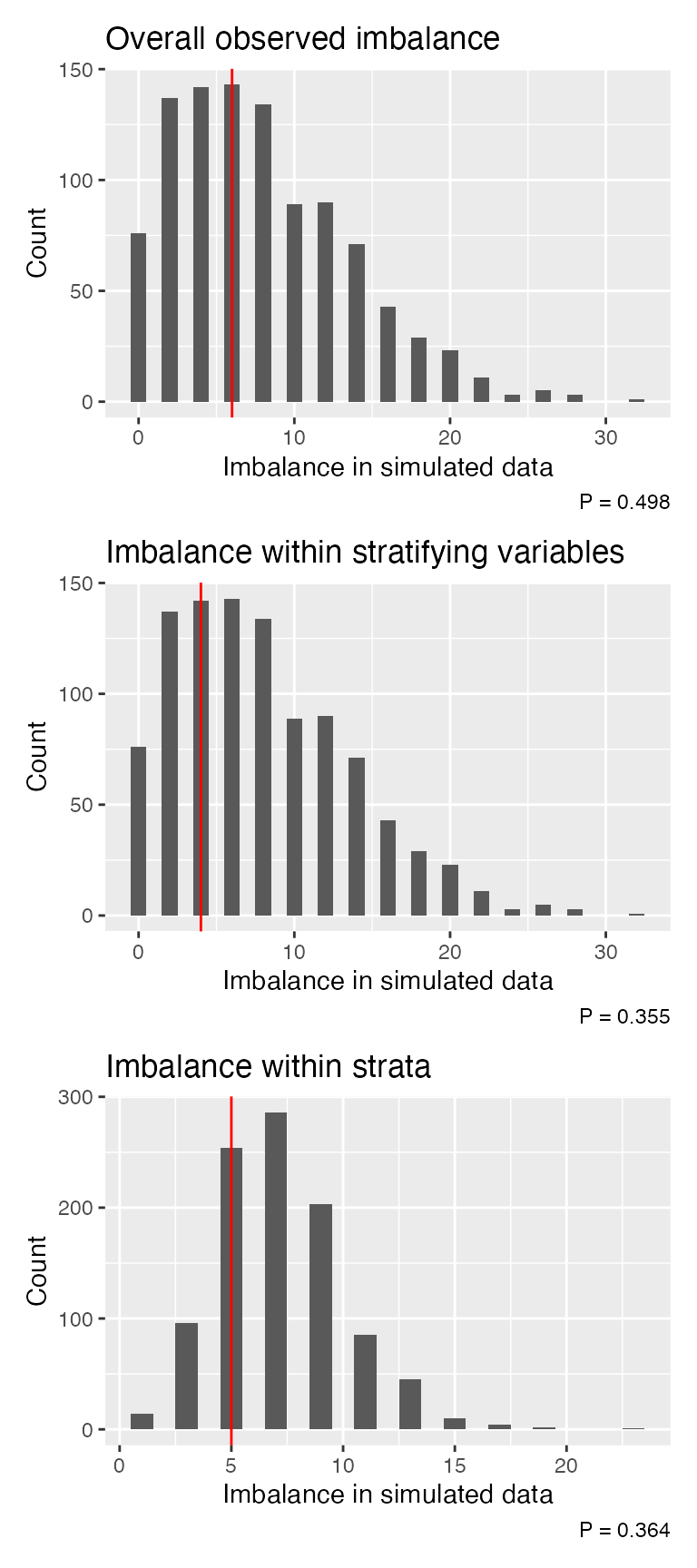 #> Probability of equal or less imbalance from random allocation: 0.364The corresponding plots show the frequency of imbalance values in the random datasets (the bars). The red vertical line indicates that from the observed data. Ideally, the observed line would be to the left of the plot. The p-value is indicated bottom right.