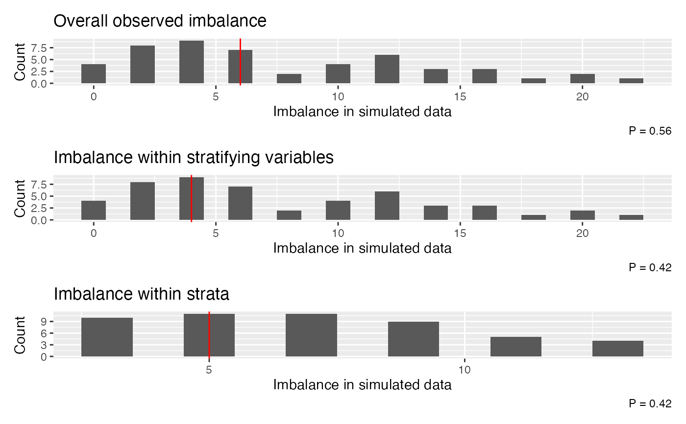 imbalance_test_plot.RdPlot histograms of imbalance values from simulated random allocation and a vertical lines to indicate the observed imbalance for each randomisation level (overall, stratification variable level, and strata level, where appropriate). The p-values from the tests are included in the figure captions.